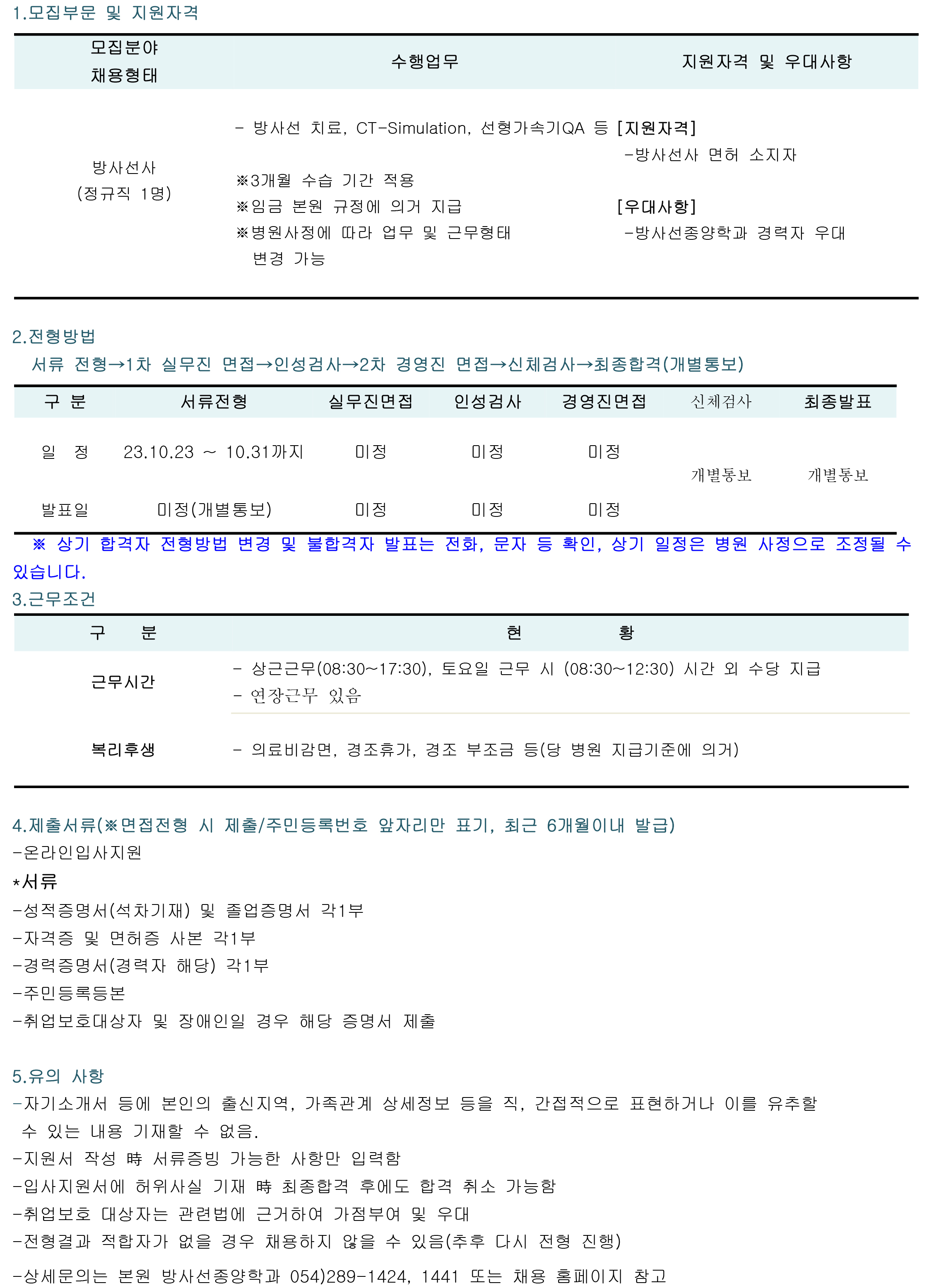 - 입사지원자에 대한 다음과 같은 사항은 병원홈페이지, 전화, 문자전송으로 고지합니다.
