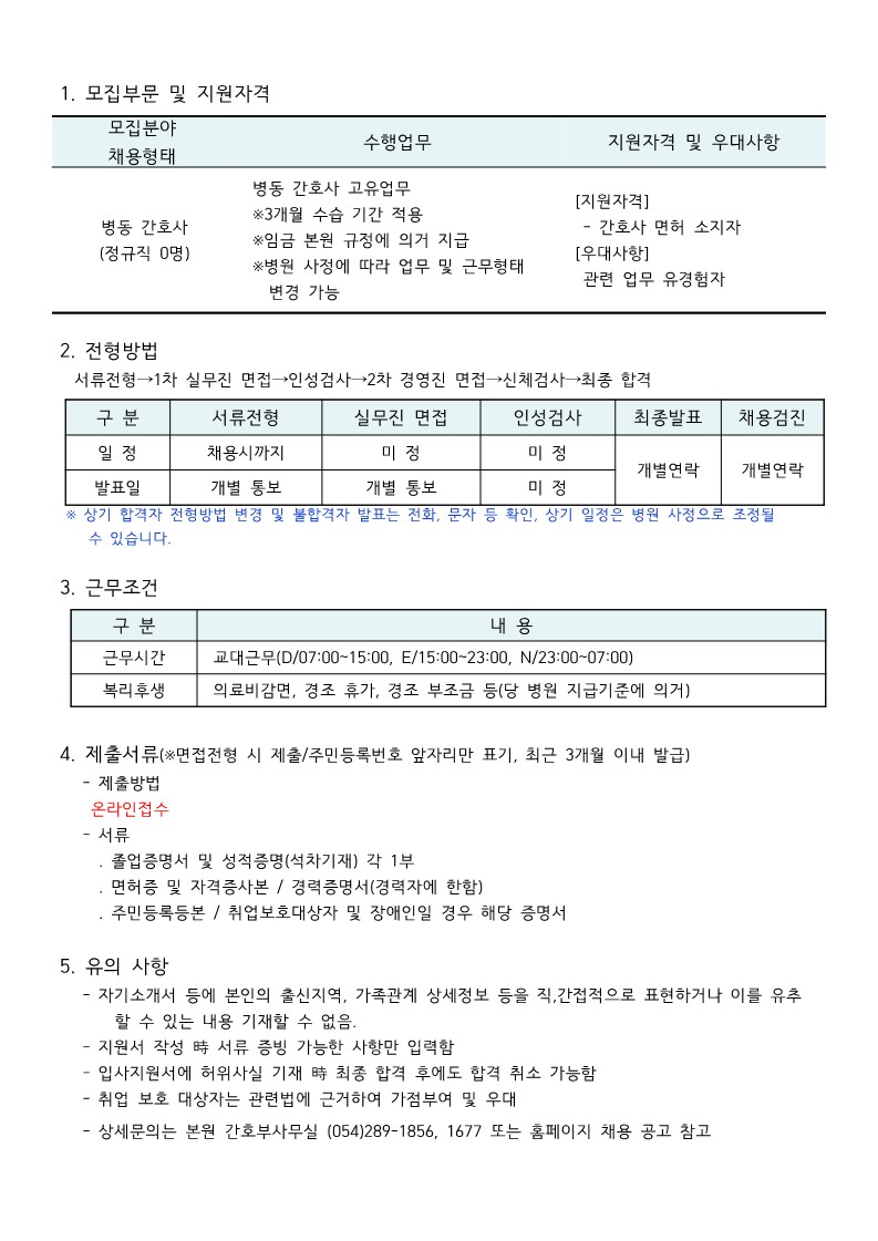 - 입사지원자에 대한 다음과 같은 사항은 병원홈페이지, 전화, 문자전송으로 고지합니다.