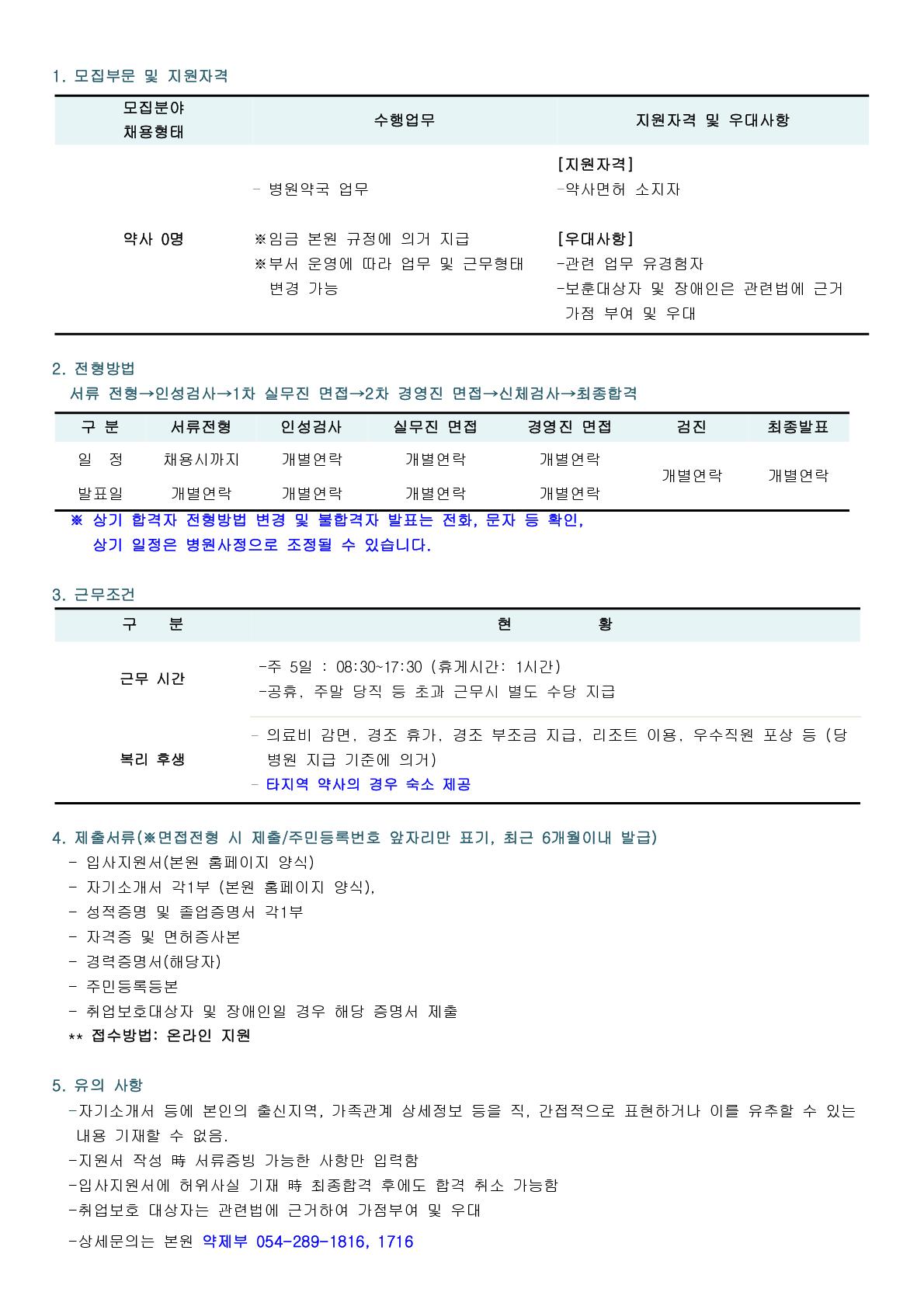 - 입사지원자에 대한 다음과 같은 사항은 병원홈페이지, 전화, 문자전송으로 고지합니다.