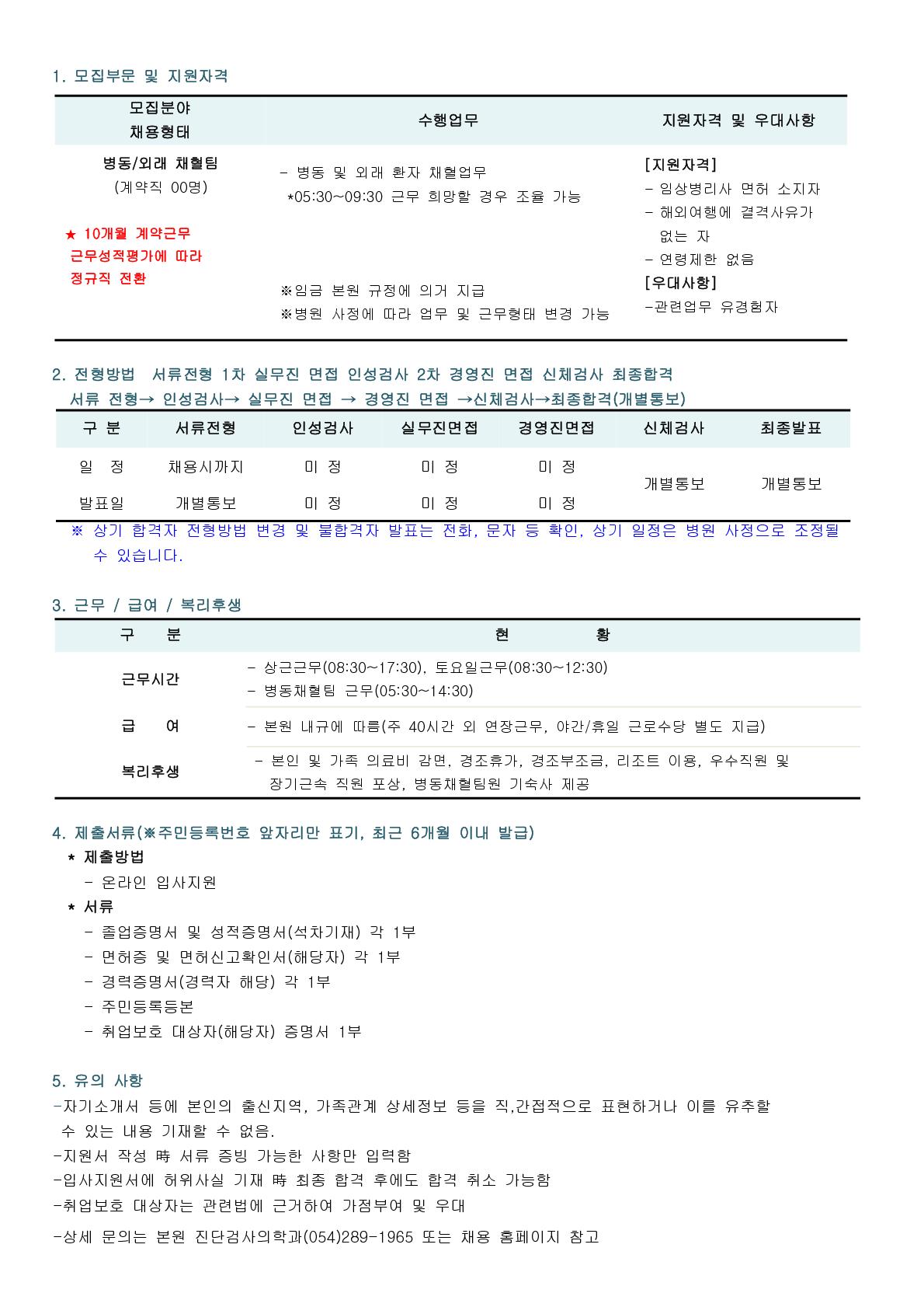 - 입사지원자에 대한 다음과 같은 사항은 병원홈페이지, 전화, 문자전송으로 고지합니다.