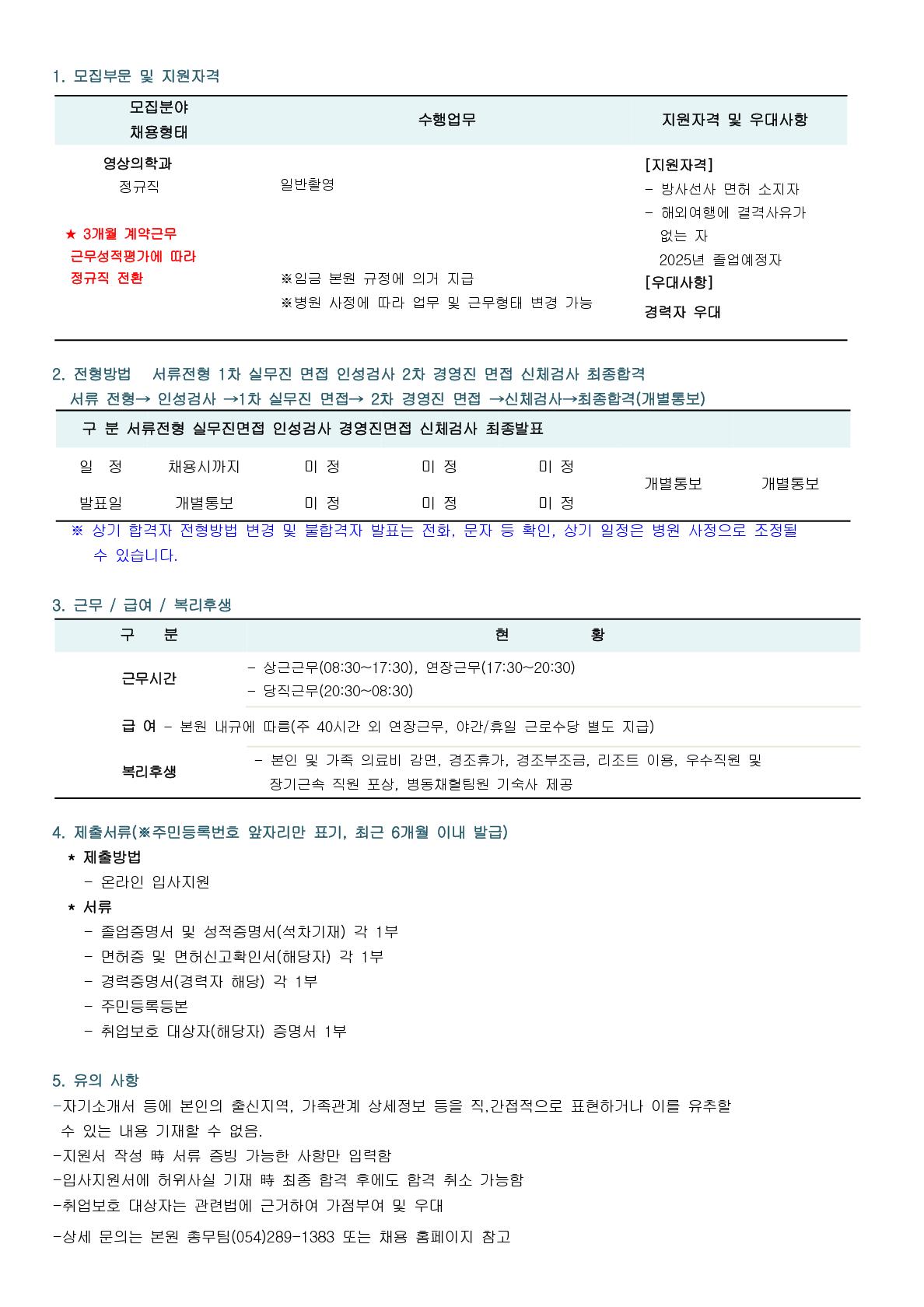 - 입사지원자에 대한 다음과 같은 사항은 병원홈페이지, 전화, 문자전송으로 고지합니다.