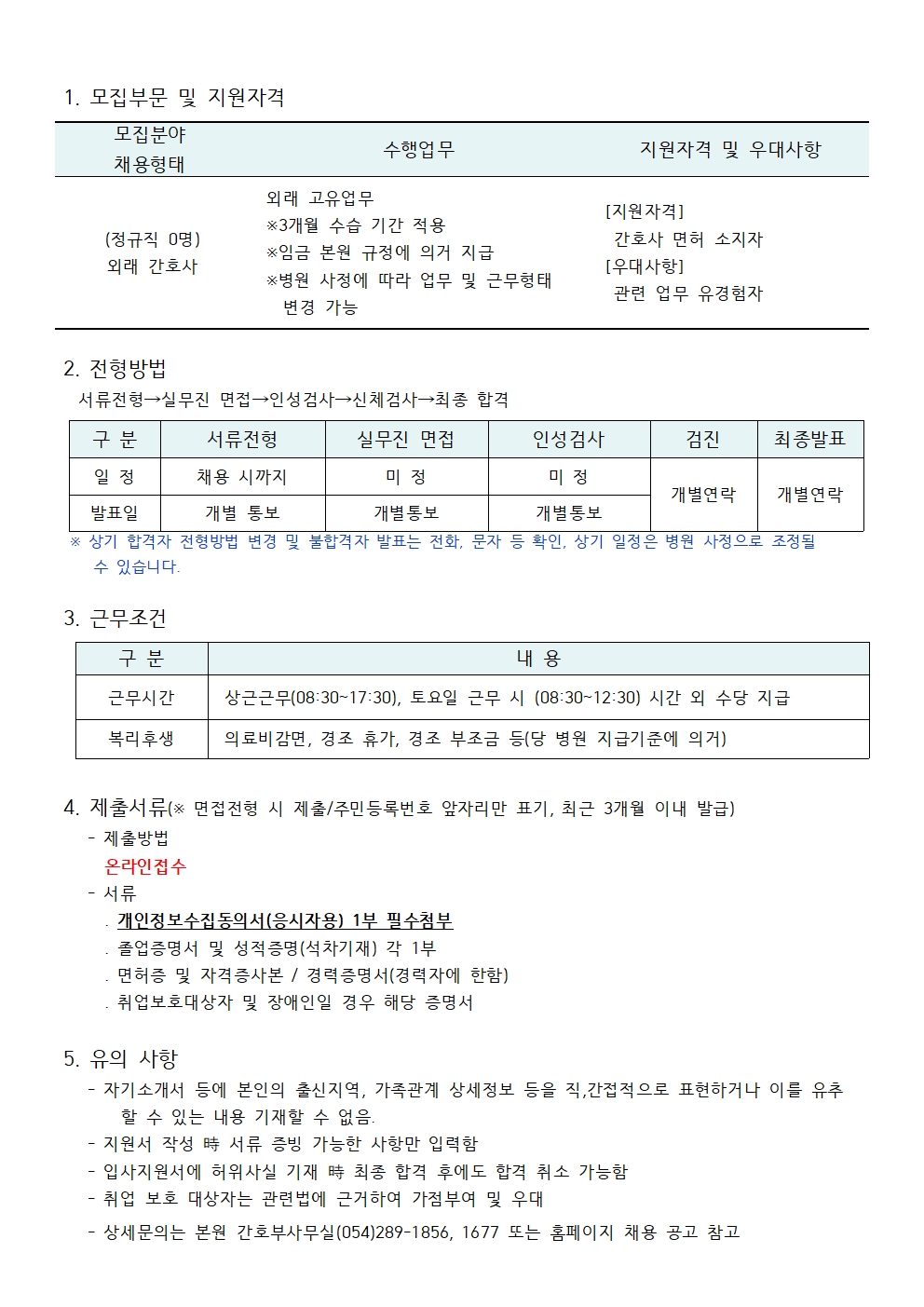 - 입사지원자에 대한 다음과 같은 사항은 병원홈페이지, 전화, 문자전송으로 고지합니다.