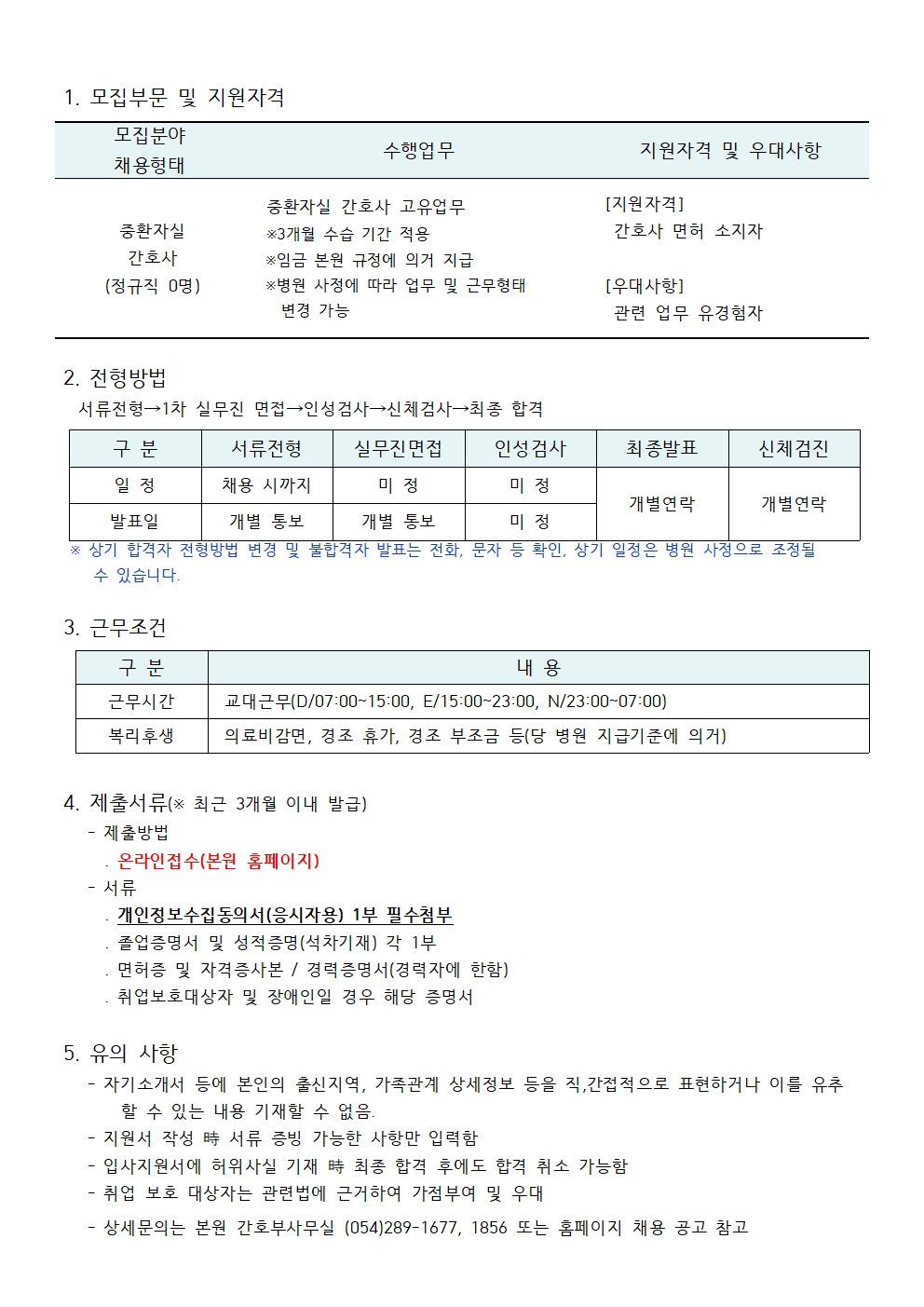 - 입사지원자에 대한 다음과 같은 사항은 병원홈페이지, 전화, 문자전송으로 고지합니다.