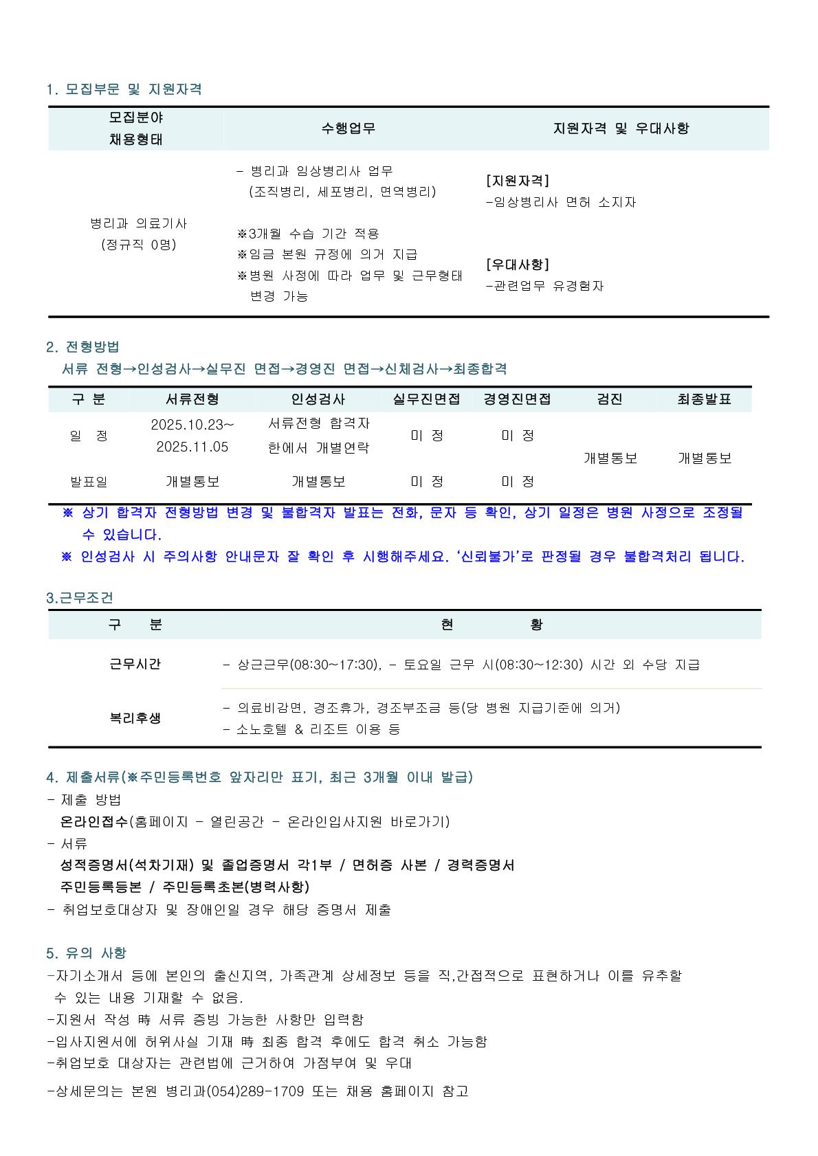 - 입사지원자에 대한 다음과 같은 사항은 병원홈페이지, 전화, 문자전송으로 고지합니다.