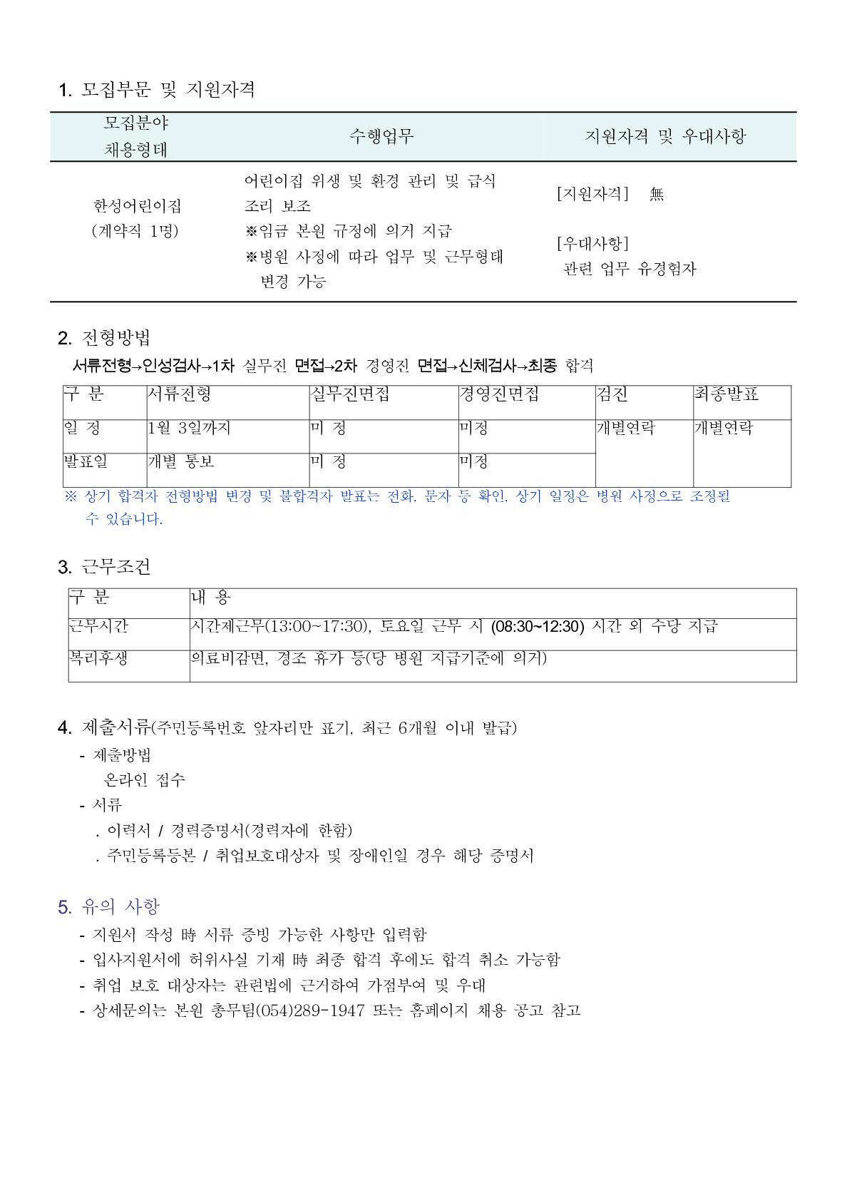 세명기독병원 한성어린이집 급식조리 보조사 채용 공고