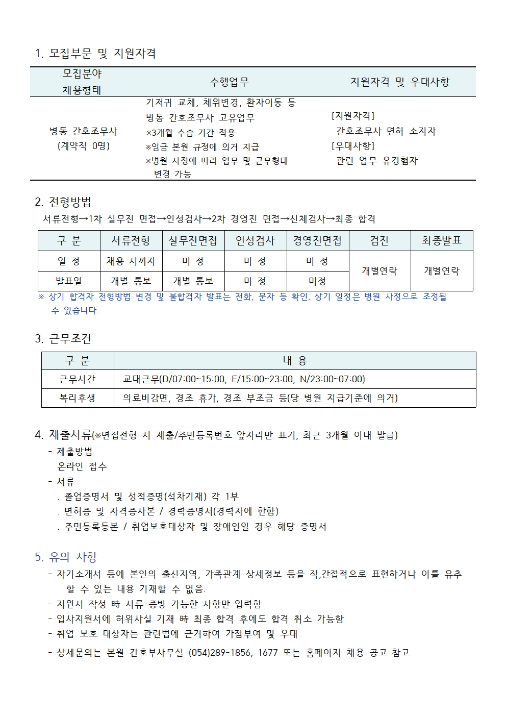 - 입사지원자에 대한 다음과 같은 사항은 병원홈페이지, 전화, 문자전송으로 고지합니다.