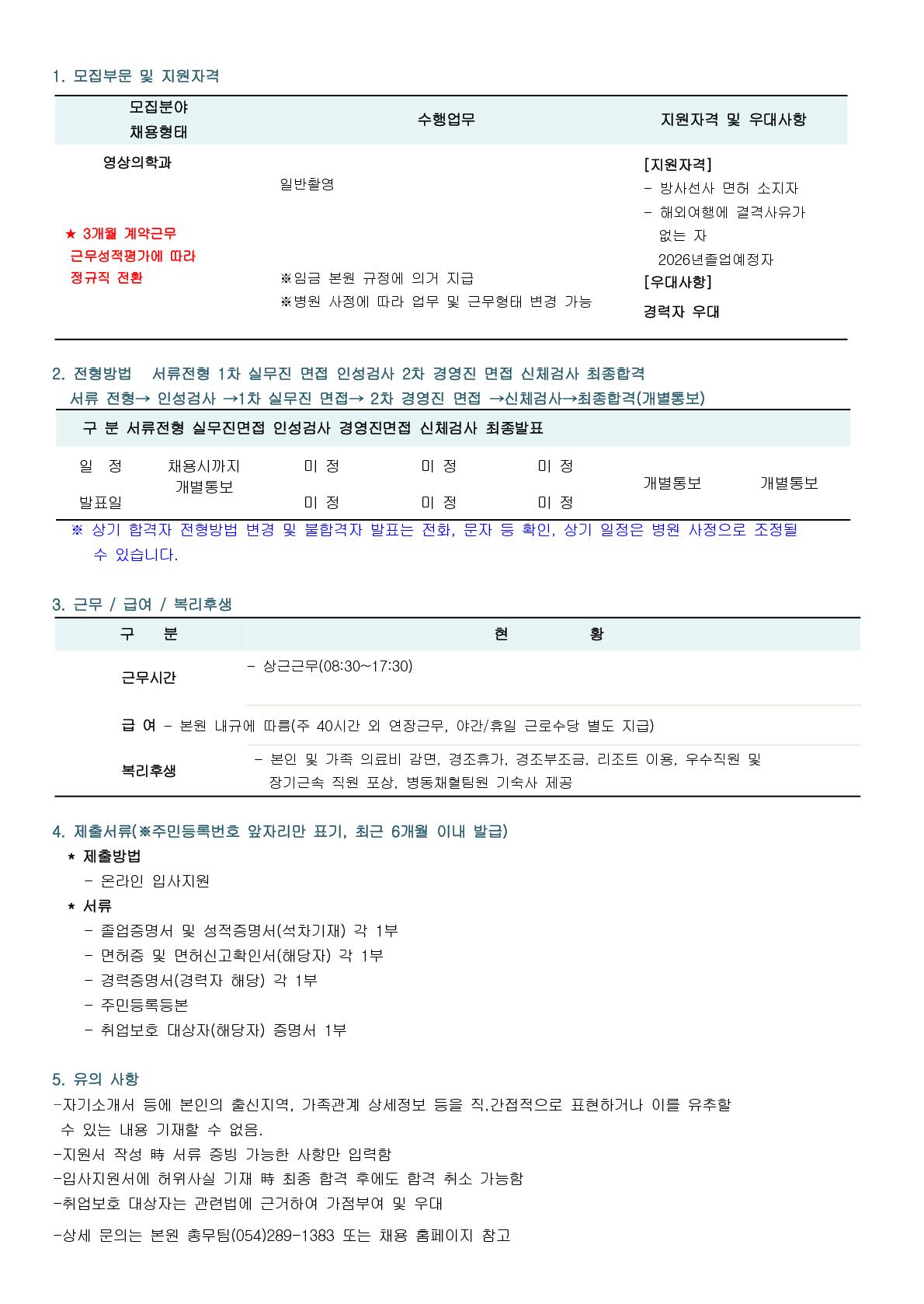 - 입사지원자에 대한 다음과 같은 사항은 병원홈페이지, 전화, 문자전송으로 고지합니다.