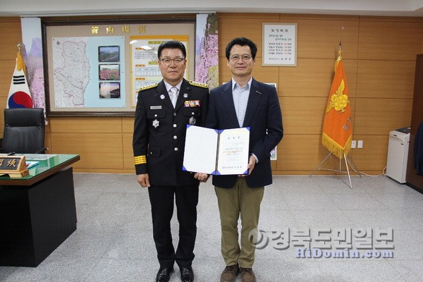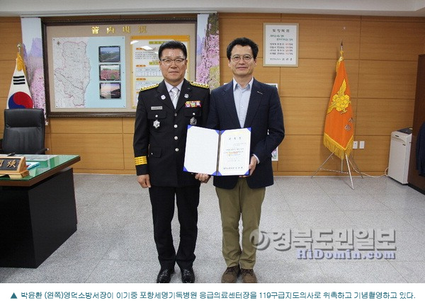 박윤환 (왼쪽)영덕소방서장이 이기중 포항세명기독병원 응급의료센터장을 119구급지도의사로 위촉하고 기념촬영하고 있다. |