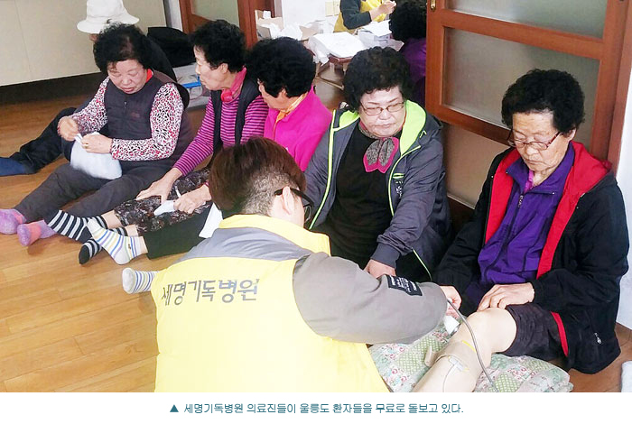 포항 세명기독병원(원장 한동선)이 수년간에 걸쳐 울릉도를 방문해 의료 환경이 열악한 주민들을 돕고자 무료진료 및 의료상담을 펼쳐 훈훈한 미담이 되고 있다.세명기독병원은 제10차 울릉도 의료봉사 활동을 지난 8일 울릉군 서면 남양 마을회관에서 진행했다. 이번 봉사활동에는 울릉도 출신 외과 서동권 처장, 상지관절센터 안기백 과장, 간호사 등 의료팀 15명을 파견했다.봉사팀은 관절환자에게 테이핑 치료법으로 무릎근육을 잡아 무릎뼈를 튼튼하게 지탱해 걷기 불편한 환자들에게 힘을 보강해주고 고주파 초음파 장비를 사용, 전기 자극으로 통증을 조절하는 치료를 했다.이외에도 혈압과 당뇨 측정 등 간단한 검사와 함께 진료 후 환자 상태에 따라 약과 주사를 처방하는 한편 물리치료를 병행하고 방문객에게 파스와 연고를 제공해 상비약으로 쓸 수 있도록 했다.세명기독병원은 지난 2011년 4월 울릉도 의료봉사를 시작한 이후 해마다 봄과 가을 2회씩 울릉도에서 의료봉사를 진행하고 있으며, 지금까지 2천여 명의 어르신들에게 무료 진료를 제공했다.또한 2011년에는 울릉군보건의료원과 진료협약을 체결해 울릉도에서 응급환자가 발생했을 때 헬기나 선박을 통해 포항에 도착하면 구급차를 지원하고 대기한 의료진이 응급수술을 진행하도록 해 울릉도 주민들이 실질적인 도움을 받을 수 있도록 하고 있다.진료를 받은 K씨(68·서면 남양리)는 "일회성으로 그칠 줄 알았는데 울릉도 주민들을 위해 꾸준하게 의료 봉사를 해줘 이젠 봉사단의 진료를 기다리게 됐다"며 "매년 찾아주는 의료진들에게 감사드린다"고 말했다.