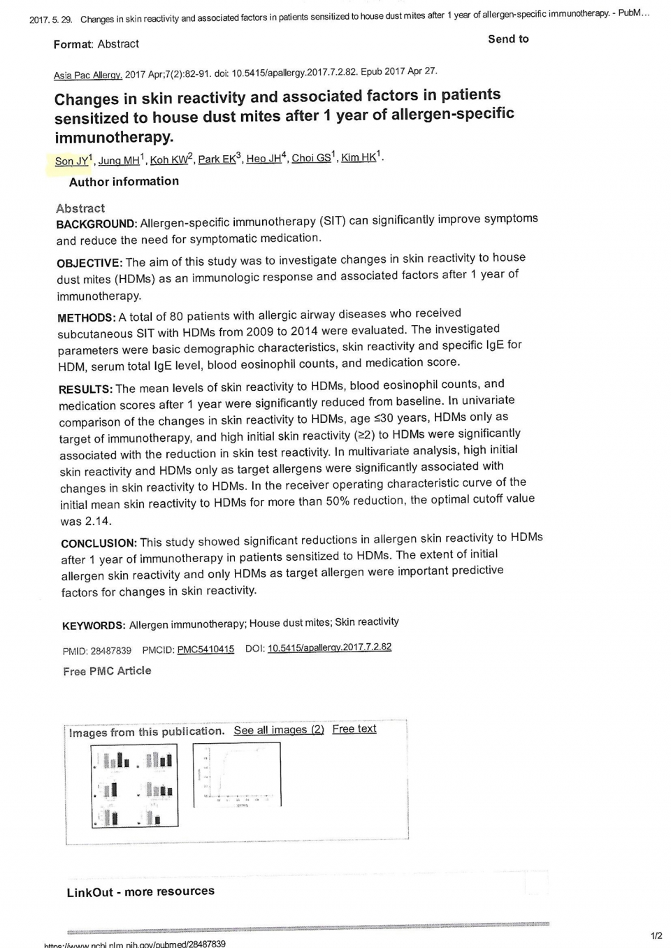 우리 세명기독병원 이비인후과 손정엽과장이 제1저자로 참여한 논문 ‘집 먼지 진드기에 감작된 환자에서 알레르겐 특이 면역 치료 1년 후 피부반응도 변화 및 연관인자’(영문제목 : Change in skin reactivity and associated factors in patients sensitized to house dust mites after 1 year of allergen- specific immunotherapy) 에 관한 논문이 SCI 학술지인 ‘Asian Pacific allergy 2017 4월호’ 에 게재 되었습니다.이 논문은 고신대학교 복음병원 알레르기 내과팀(주임교수 김희규)과 공동 연구한 것으로서, 최근 대기오염 및 미세먼지로 인해 각종 알레르기 질환발생률이 높아지고이에 따른 집 먼지 진드기의 감작 빈도가 높아지는 상황에서 호흡기 및 알레르기 질환에 노출된 환자의 연구 및 치료에 크게 기여할 것으로 판단됩니다.우리병원 이비인후과에서는 알레르기 질환의 근본적인 면역치료로 설하 요법(SLIT : 환자 본인이 스스로 혀 밑에 알레르겐을 복용하는 치료법) 및 피하 요법(SCIT : 병원에 내원하여 주사를 맞는 치료법)을 시행하고 있습니다.