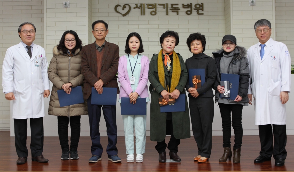 * 한동선 병원장과 류인혁 원장이 "제3회 투병 간병 수기 공모전" 입상자와 함께 기념 촬영을 했다.우리 병원이 2일 오전 8시 본관 10층 광제홀에서 ‘2018년 시무식’을 열었습니다. 전 직원이 참석한 시무식에서 우리 병원은 올해 병원 목표를 ‘환자안전 향상의 해’로 정하고, 목표 달성을 위한 의지를 다졌습니다. 새해를 맞아 진행된 ‘20년 근속 직원’에 대한 시상에서는 최경숙(의료사회사업직) 팀장 등 5명이 수상, 직원들에게 큰 박수를 받았습니다. 또한 지난해 10월 열렸던 ‘제3회 투병·간병 수기 공모전’ 입상자들에 대한 시상을 함께 진행해 더욱 뜻깊은 시간이었습니다. 지난 2011년 시작해 3회째를 맞은 공모전에서 ‘간병·투병 환자와 의료인의 교감, 병원과의 인연 등 세명기독병원과 관계된 모든 것’이라는 주제로 치열한 경쟁을 뚫고 높은 평가를 받은 박현주씨 등 모두 14명이 수상의 기쁨을 안았습니다.대상인 사랑상에 입상해 상금 100만원을 받은 박현주씨는 ‘엄마의 자리를 다시 찾아 준 고마운 병원’이라는 제목으로 2013년 엄마가 일하던 중 골반이 골절되는 등 큰 사고를 당해 몇 차례 수술과 오랜 기간 입원으로 보호자로서 힘든 시간을 겪었지만, 이를 극복할 수 있도록 옆에서 묵묵히 도와주고 격려해준 담당 의사와 간호사 등 병원 직원에 대한 고마움을 섬세하게 표현해 상을 거머쥐었습니다. 이 밖에도 김경엽씨가 ‘콩이랑 팥이랑에서 상영되는 인생 드라마’로 믿음상과 상금 70만원을, 임완수씨는 ‘남들이 모르는 중환자실에서의 따뜻한 간호와 간병’으로 소망상과 상금 50만원을, 한지화씨와 이다혜씨가 ‘아버님 건강하세요’와 ‘병원에서 만난 소중한 인연’으로 화합상과 상금 30만원을 각각 받는 등 다양한 사연으로 감동을 선사했습니다. 한동선 병원장은 “지난해 나라 안팎에 많은 일이 벌어져 힘든 시기를 겪어 올해 상황도 예측하기 힘들다”라면서도 “우리 병원은 매년 해오듯이 우선 환자 안전을 생각하고, 맡은 자리에서 자신의 일을 해나간다면 잘 극복해나갈 것”이라고 강조했습니다.또한 “직원 모두 합심해서 신나는 일터로 만들어 나가자”고 덧붙였습니다. 한편 세명기독병원은 공모전 수상작을 모아 향후 수기집을 발간해 다른 환자와 가족 등에게 희망을 선사할 예정입니다.