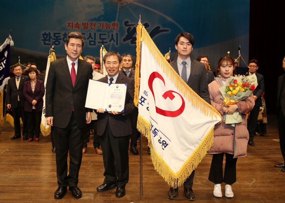 *김진의(사진에서 중앙) 행정처장이 지난 7일 포항시청에서 지진 피해 주민을 위한 의료봉사 부문 정부포상 대상기관으로 우리 병원이 선정돼 행정안전부 장관 표창을 받았습니다.“‘네 이웃을 위해 봉사하라’라는 설립 이사장님의 뜻을 지속적으로 실천합니다.” 우리 병원이 지난 7일 포항시청 대잠홀에서 지진 피해 주민을 위한 의료봉사 부문 정부포상 대상기관으로 선정돼 행정안전부 장관 표창을 받았습니다. 지진이 일어났던 지난해 11월 15일부터 7회에 걸쳐 우리 병원은 이재민을 위한 대피소가 설치된 대도중학교와 흥해실내체육관에 의료봉사팀을 파견해 진료 봉사를 적극적으로 펼쳤습니다.또한 같은 달 30일 포항시를 통해 ‘지진 피해 복구 성금 1억원’을 전국재해구호협회에 전달했습니다. 한동선 병원장은 “우리 병원은 지역민을 위한 의료기관이라는 것을 항상 잊지 않고 있으며, 앞으로도 어려운 이웃을 찾아 ‘사랑을 실천하는 병원’으로서의 역할을 게을리하지 않겠다”라고 소감을 밝혔습니다.이어 “지역에 필요한 병원, 어려울 때 앞장서는 병원으로 나아가겠다”라고 덧붙였습니다.