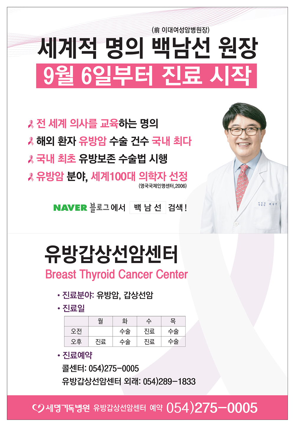 백남선 원장은 원자력병원장,건국대병원장, 이화여대 여성암병원장 등을 역임했고 이번에 뜻한 바 있어 포항세명기독병원 유방갑상선암센터 병원장으로 부임했습니다.