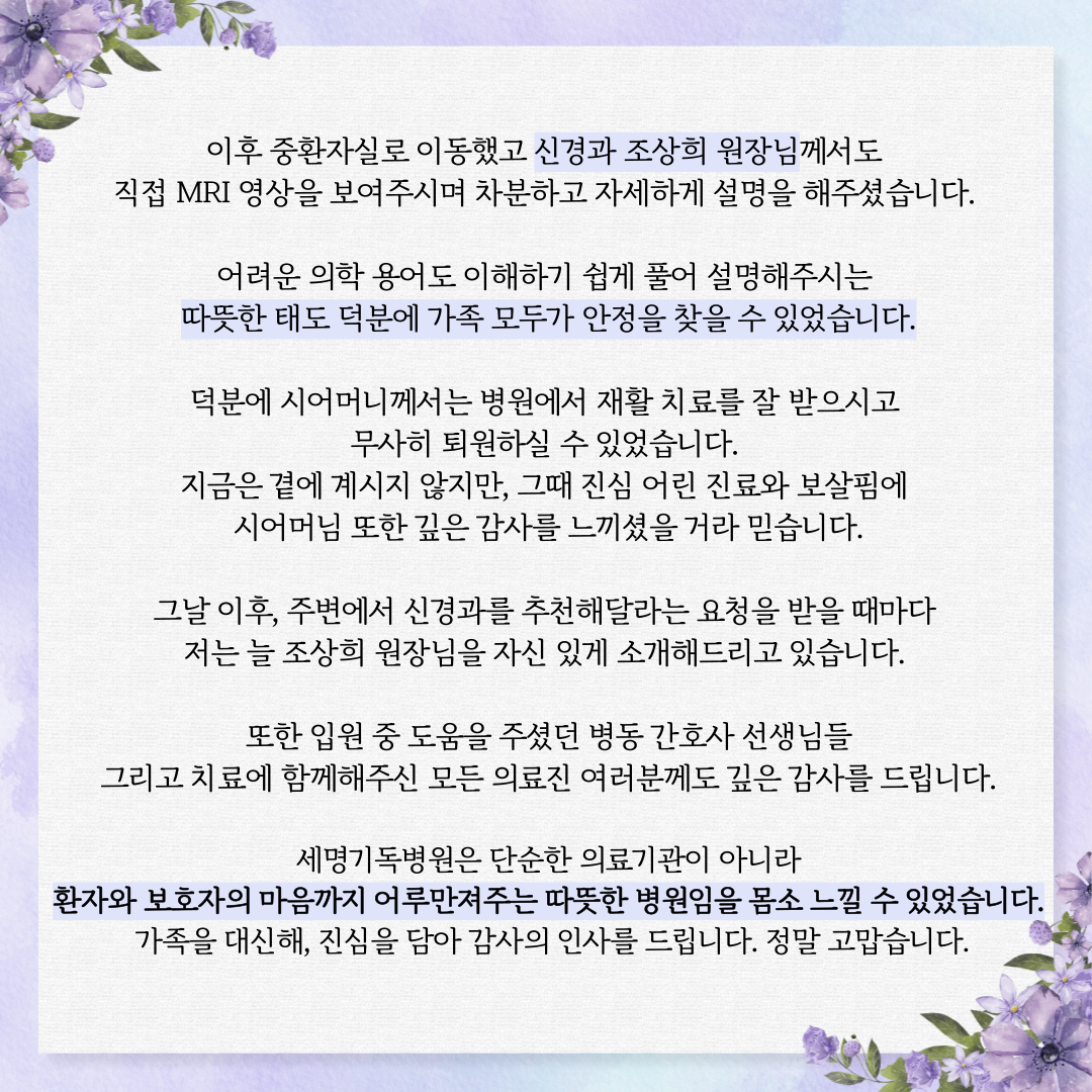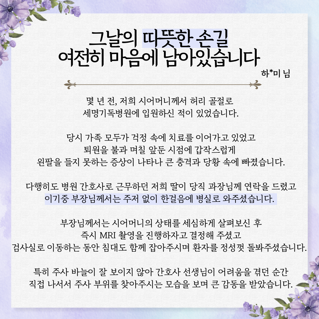 첫번째 사연은 입원의학과 이기중 부장님, 신경과 조상희 원장님 미담글입니다.