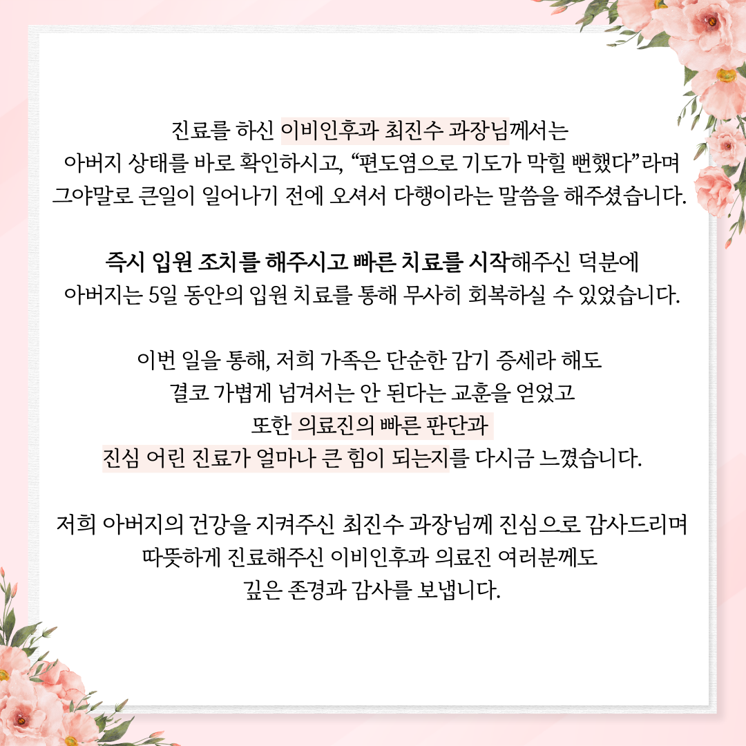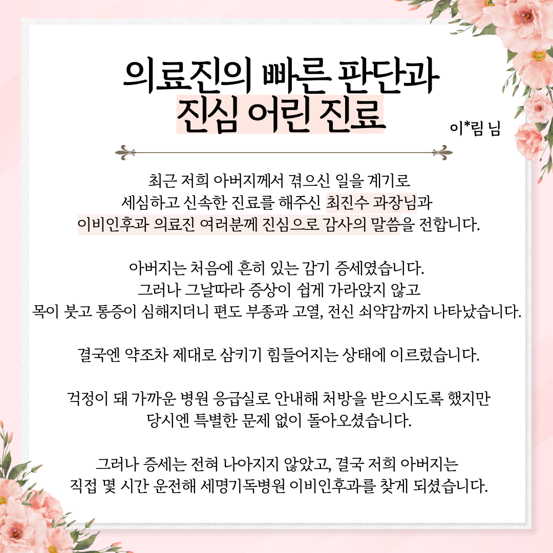 두번째 사연은 이비인후과 최진수 과장님 미담글입니다.
