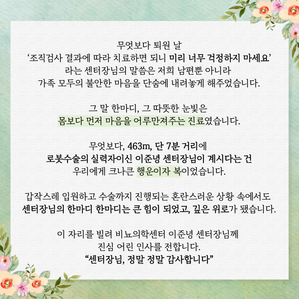 다섯번째 사연은 비뇨의학센터 이준녕 센터장님 미담글입니다.