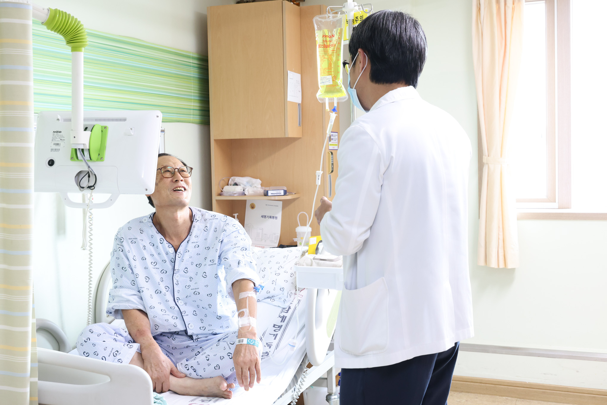 세명기독병원 지역심뇌혈관질환센터 류성주 과장(사진 오른쪽)이 뇌졸중 진단 후 응급 뇌혈관 조영술과 혈관 내 색전제거술을 받고 후유증 없이 회복 중인 A씨를 회진하고 있는 모습 |