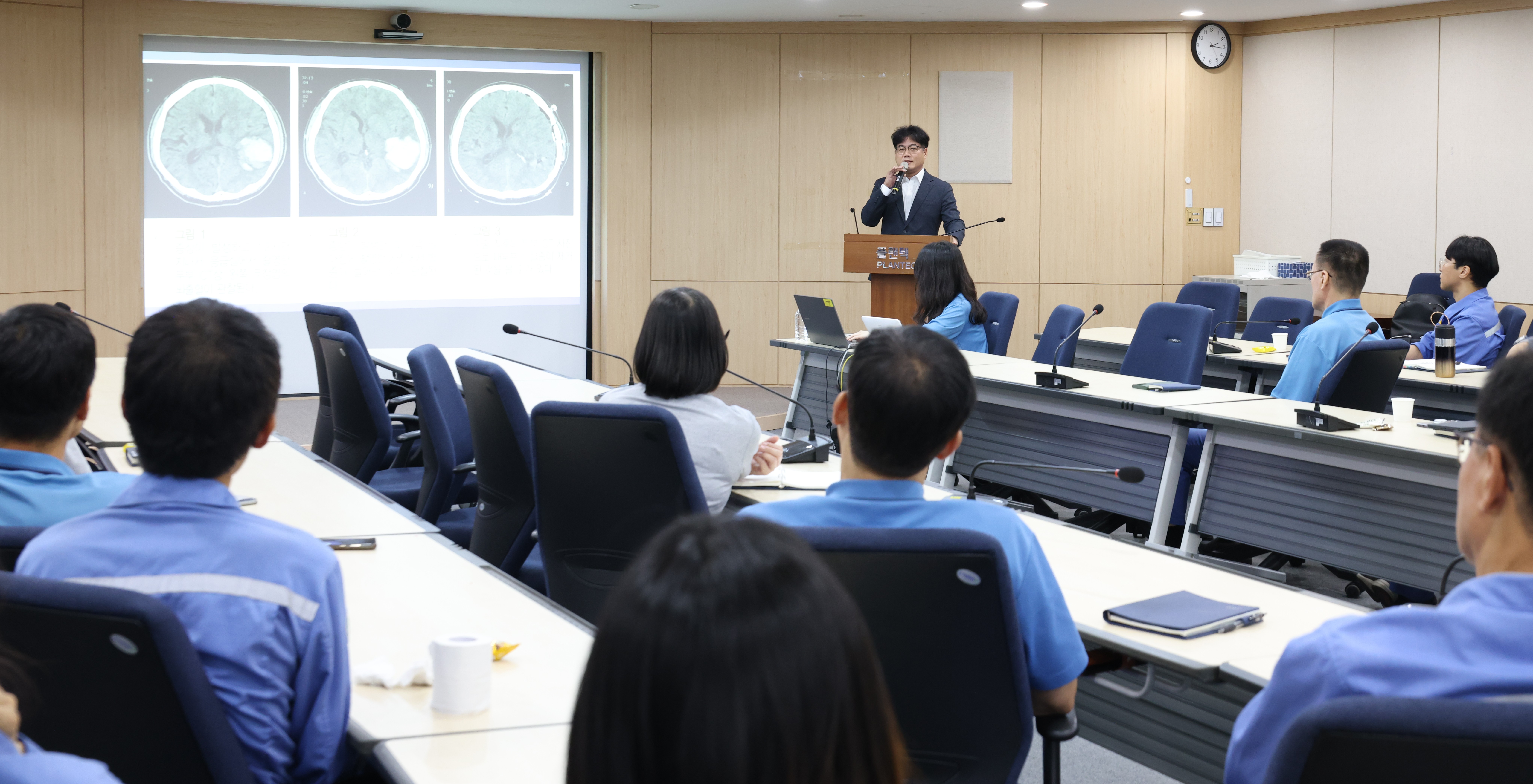 3. 세명기독병원 지역심뇌혈관질환센터 조재훈 부장이 9일 플랜택 본사에서 임직원 대상으로 강의하는 모습 |