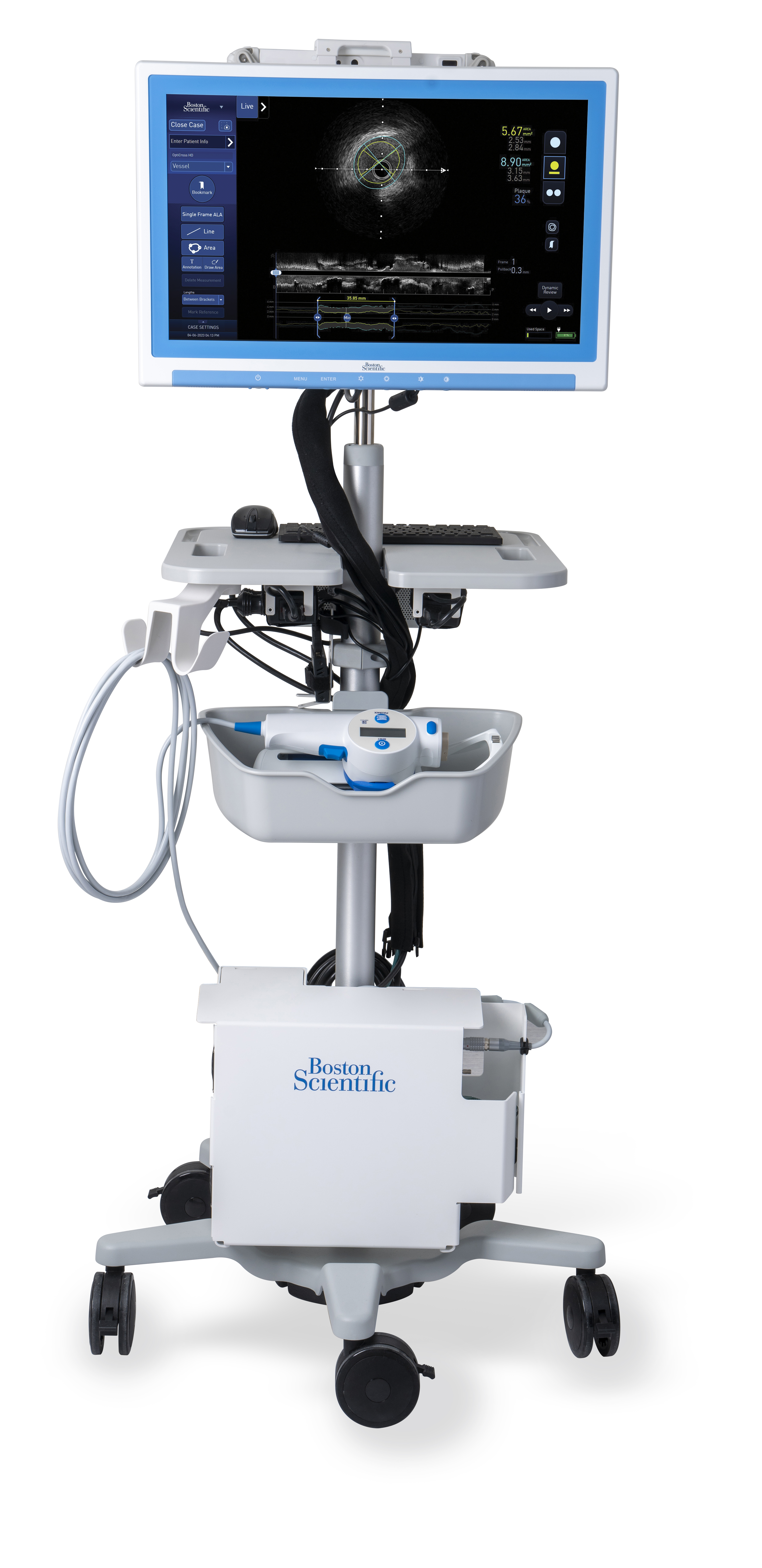 아비고 플러스 시스템은 고해상도 카테터와 360도 회전 트랜스듀서(초음파를 쏘고 받는 센서 장치)를 통해 혈관 내부 병변을 촬영, 3차원 초음파 영상을 구현합니다. 이는 기존의 2차원 관상동맥조영술 영상보다 정밀도가 높아 정확한 진단과 치료 계획 수립이 가능하며, 시술 성공률 향상과 합병증 발생 위험을 줄일 수 있습니다. 특히 머신러닝(Ai) 기술을 활용한 자동화 병변 평가(Automated Lesion Assessment·ALA) 기능을 탑재해, 시술 중 병변 부위를 자동 분석하고 혈관을 정밀 측정함으로써 의료진의 임상적 판단을 한층 정교하게 보조합니다.