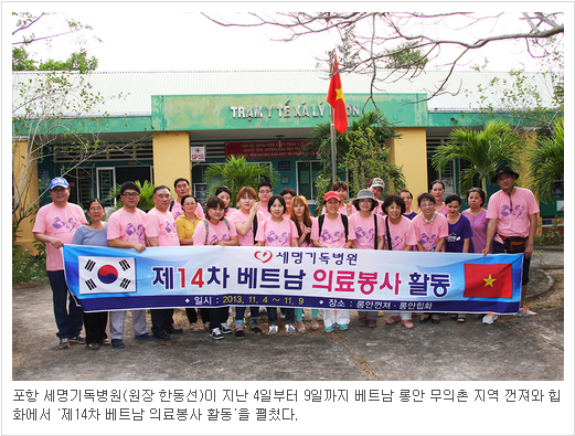 포항 세명기독병원(원장 한동선)이 지난 4일부터 9일까지 베트남 롱안 무의촌 지역 껀져와 힙화에서 "제14차 베트남 의료봉사 활동"을 펼쳐 훈훈한 미담이 되고 있다.
