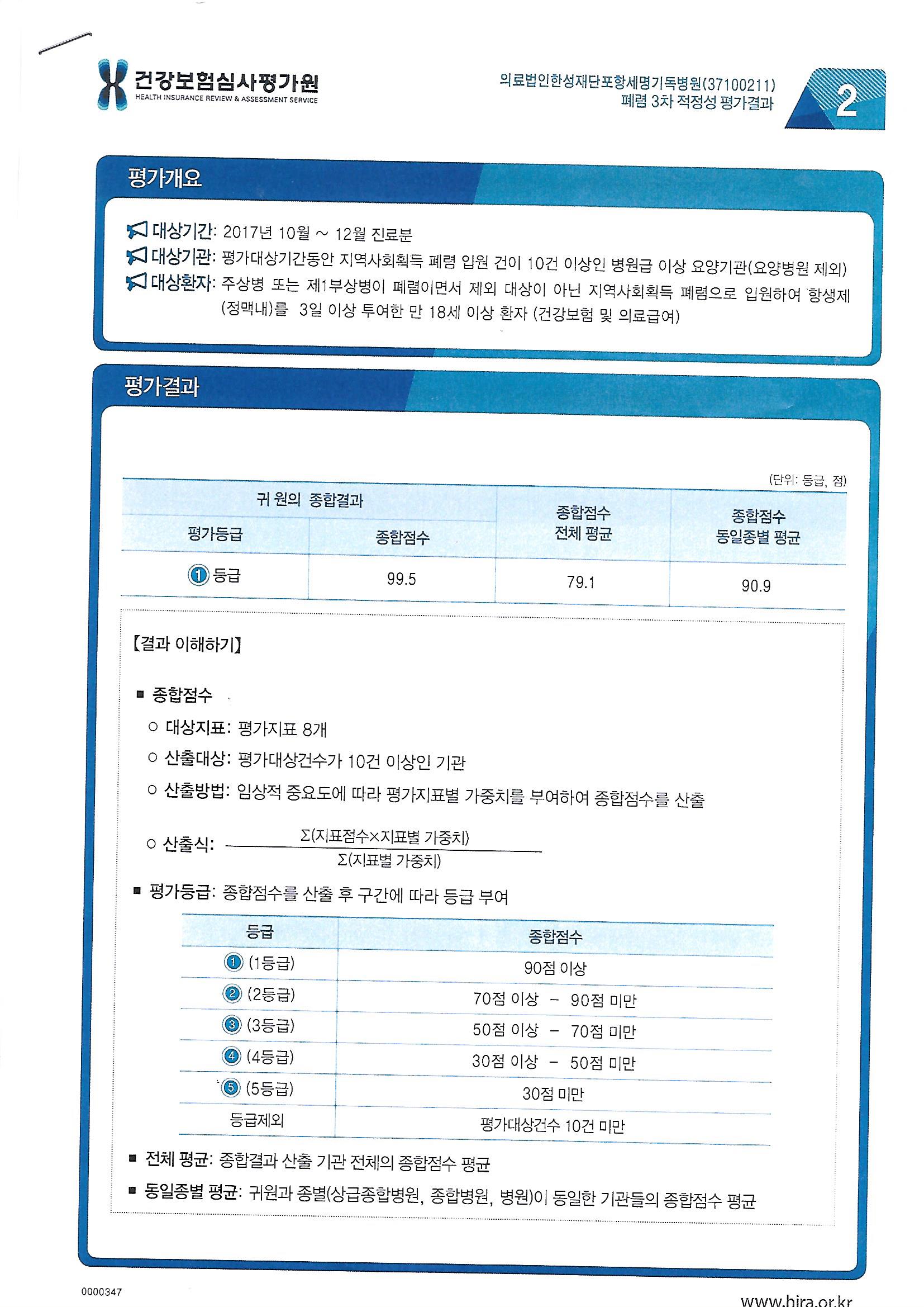 폐렴 적정성 평가 분야는 산소포화도 검사 실시율과 중증도 판정 도구 사용률, 객담도말검사 처방률, 객담배양검사 처방률, 첫 항생제 투여 전 혈액배양검사 실시율, 병원 도착 8시간 이내 항생제 투여율, 금연교육 실시율, 폐렴구균 예방접종 확인율 등 8개 항목이며 우리 병원은 5개 항목에서 100점 만점을 받았습니다. 이에 종합점수 99.5점을 기록, 전체 평균 79.1점보다 월등히 높은 점수를 받으며 1등급에 올랐습니다.