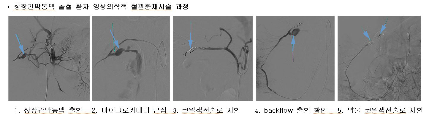 시술을 진행한 영상의학과 전문의 정석환 과장은 환자 치료 과정에 대해“환자는 CT 상 상장간동맥 출혈이 확인돼 이에 대한 지혈이 필요했습니다. 치료를 위해 혈관조영실에서 서혜부 대퇴동맥으로 접근해 카테터를 상장간막동맥(SMA: Superior mesenteric artery)으로 삽입, 조영제를 주입해 혈관조영술을 얻었습니다. 분지하는 혈관 중 중간결장동맥(middle colic artery)의 출혈을 확인하고 마이크로카테터를 이용해 출혈 부위 근위부 (proximal portion)에 코일색전술을 시행해 지혈했습니다. 또 backflow 출혈은 회장결장동맥(Ileocolic artery branch)으로 접근해 중간결장동맥 원위부(distal portion) 출혈 위치에 약물과 코일색전술로 지혈하고 시술을 마쳤습니다. 지혈이 끝나고 환자의 활력 징후가 안정됐고 바로 중환자실로 이동했다”고 설명했습니다.