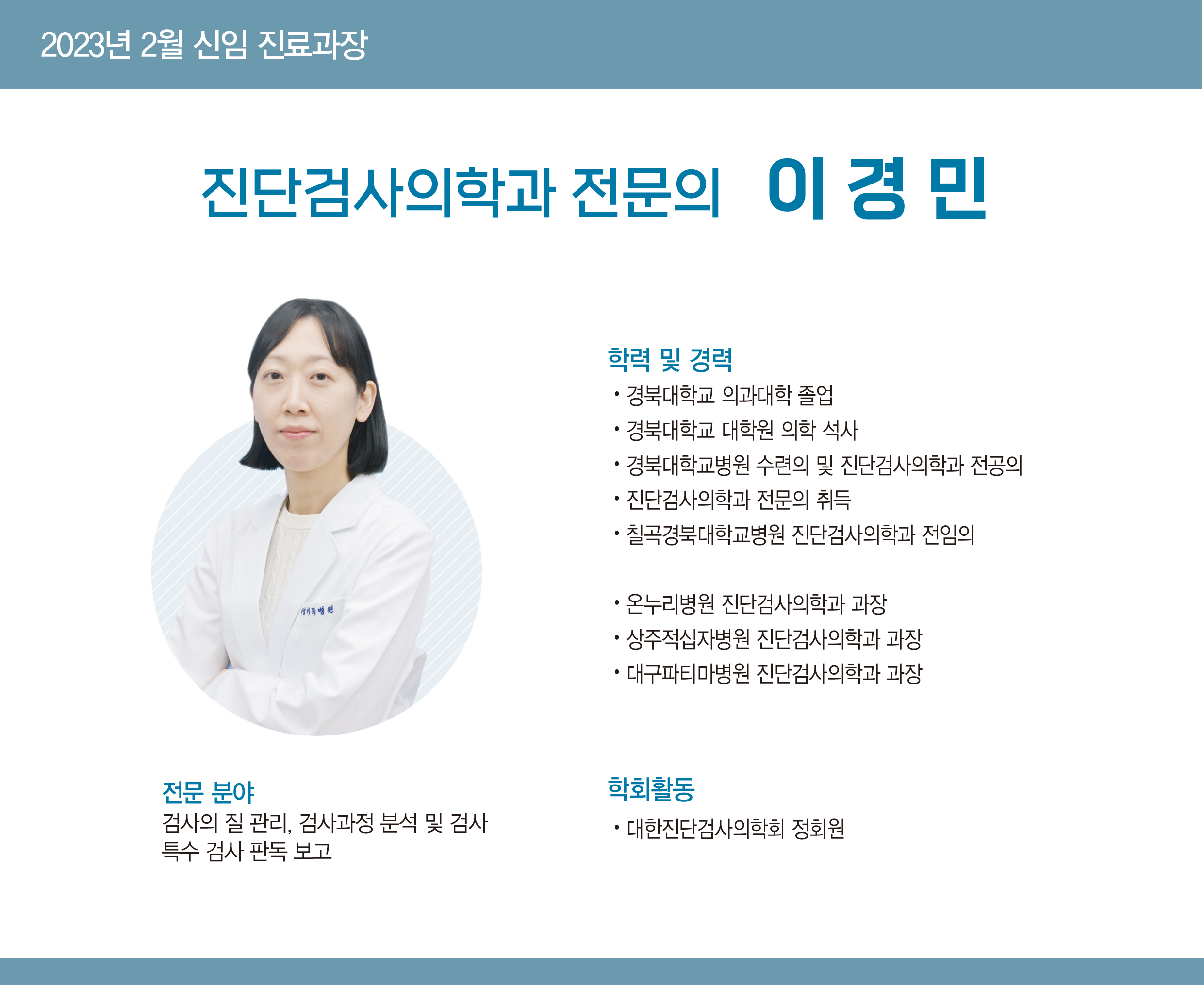이경민 과장은 경북대학교 의과대학을 졸업하고 경북대학교 대학원 의학 석사 과정과 칠곡경북대학교병원 진단검사의학과 전임의 과정을 마친 후