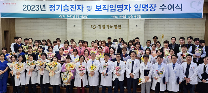 이날 진료부 심장내과 김유민 부장 등 3명을 비롯해 행정부 전산팀 이진남 차장 등 12명, 간호부 수술실 이승희 차장 등 76명, 진료지원부 혈관조영실 김상연 부팀장 등 28명 등 총 119명이 직원이 대거 승진했습니다. 이어 심장내과·응급의학과·중환자의학과·가정의학과·핵의학과·소화기내과·외과·진단검사의학과 등 전문의 8명과 신규 간호사 98명 포함 간호부 106명, 의료기사 등 진료지원부 직원 16명 등 총 130명의 신입 직원에 대한 임명장 수여식을 진행했습니다.
