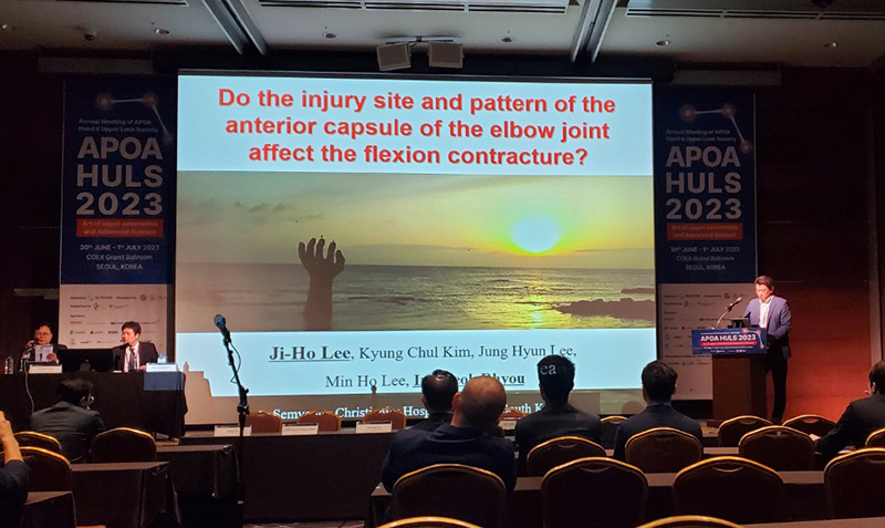 이날 류인혁 원장은 대한수부외과학회 회장으로 인사말을, 이지호 부장은 ‘팔꿈치 관절의 전방 캡슐의 손상 부위와 패턴이 굴곡의 발달에 영향을 미칠까?(Do the injury site and pattern of the anterior capsule of the elbow joint affect the development of flexion contracture?)’ 라는 주제로 발표했습니다.