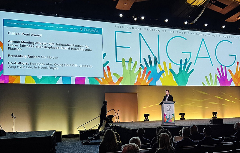이번 제78회 미국수부외과학회에는 전 세계에서 제출된 e-poster 중 701개의 주제가 선정됐고, 우리 병원 상지관절센터 제출 주제는 Top 30 presentation으로 채택되어 구연 발표를 할 수 있는 기회가 주어졌습니다. ASSH는 선정된 701개의 주제 중 2개의 주제에 대해서 Best Poster Award 시상 했으며, Mayo clinic의 Alexander Y. Shin의 "Voluntary Neuromuscular Control of Gracilis Free Functional Muscle Transfer for Elbow Flexion: Spinal Accessory Nerve vs Intercostal Nerve" 주제는 Bruner Award, 우리 병원 상기 주제는 "2023 ASSH Clinical Pearl Award"에 선정되었습니다.