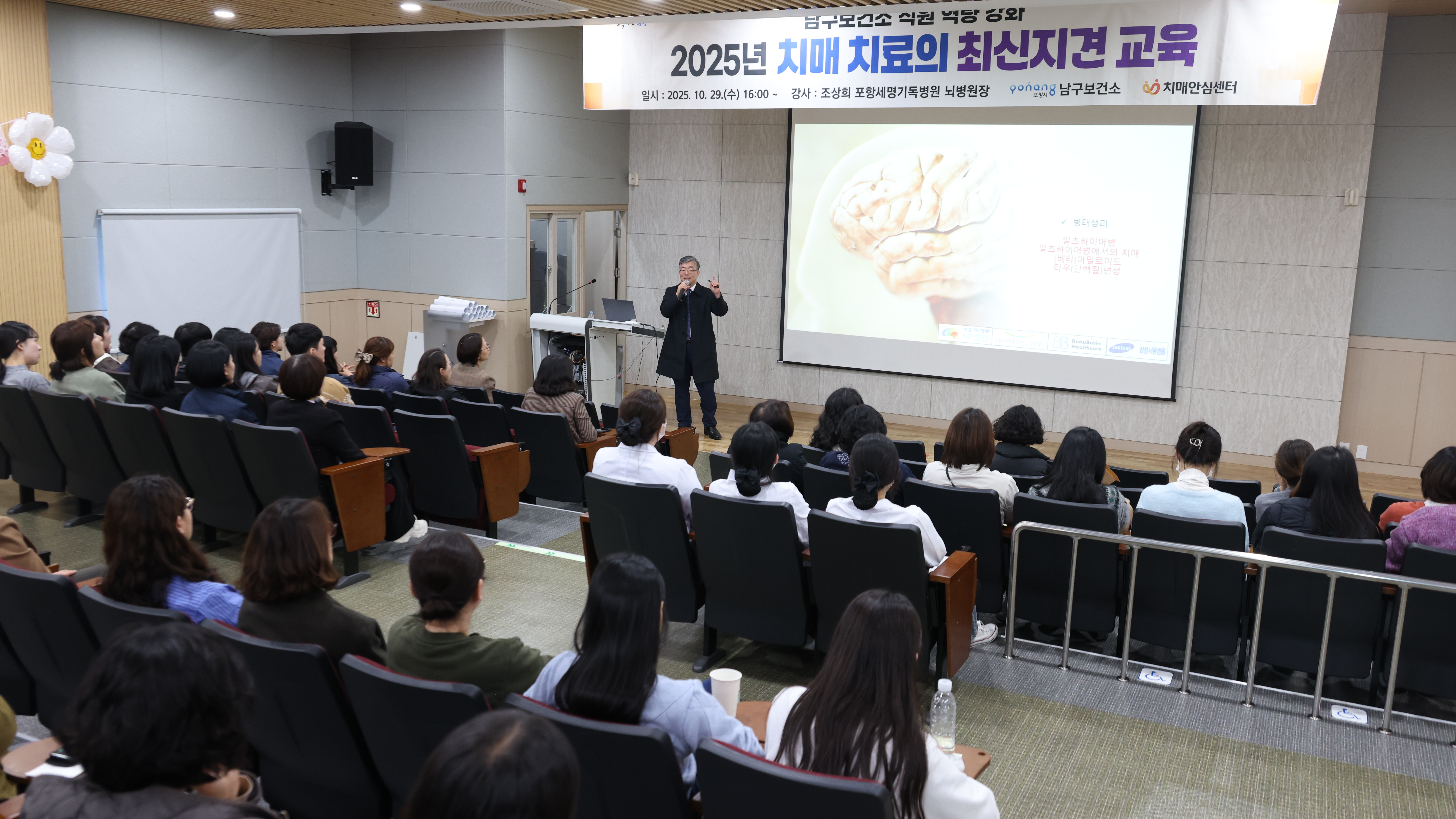 남구보건소 직원 50여 명을 대상으로 열린 이번 강의는 보건소 직원 역량 강화를 위해 마련됐습니다. 조상희 센터장은 최신 치매 연구 동향을 비롯해 예방, 치료, 관리 전반에 대한 구체적인 내용을 전달하며 실제 치료 사례를 제시, 참석자의 높은 관심을 끌었습니다.
