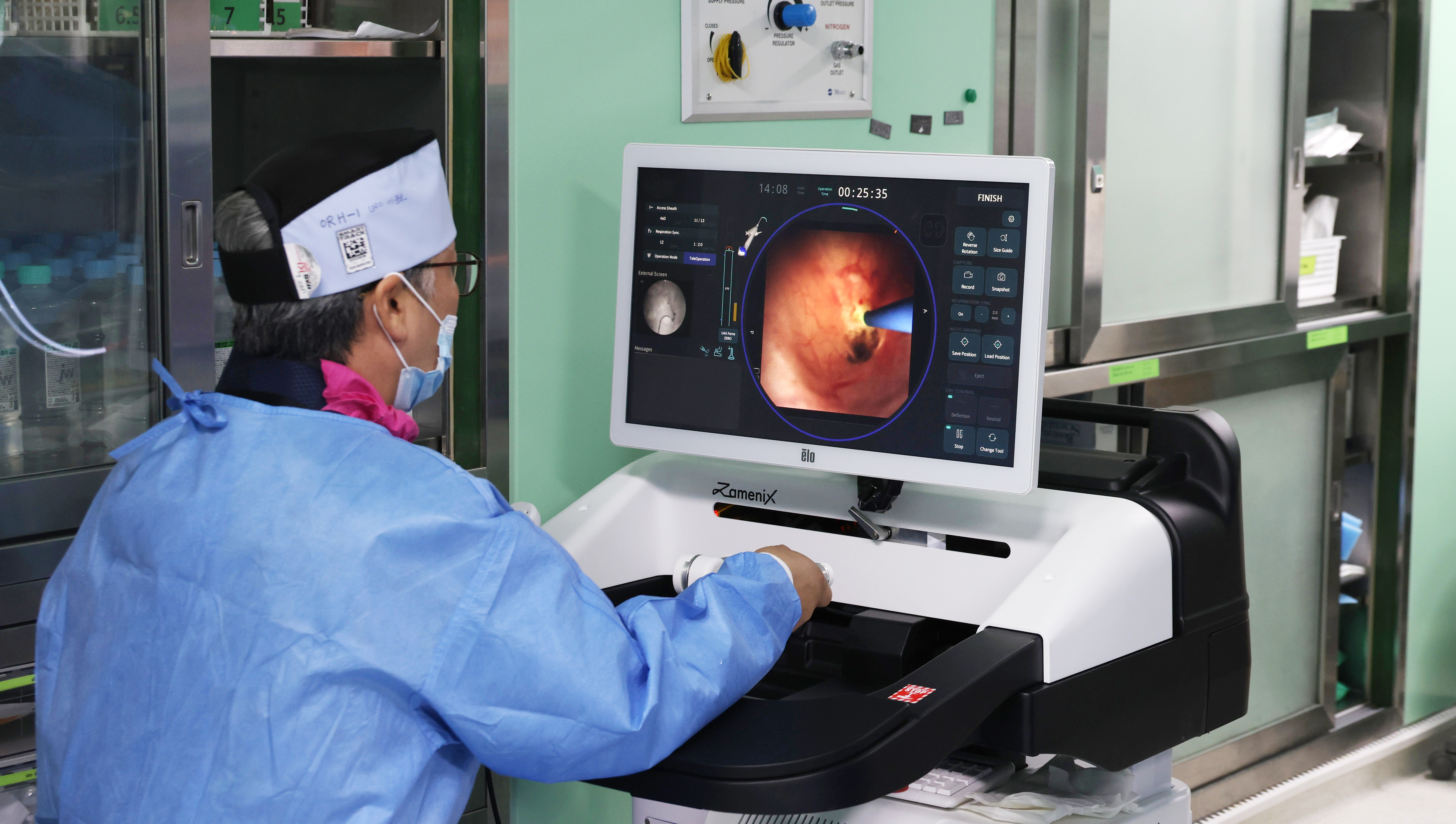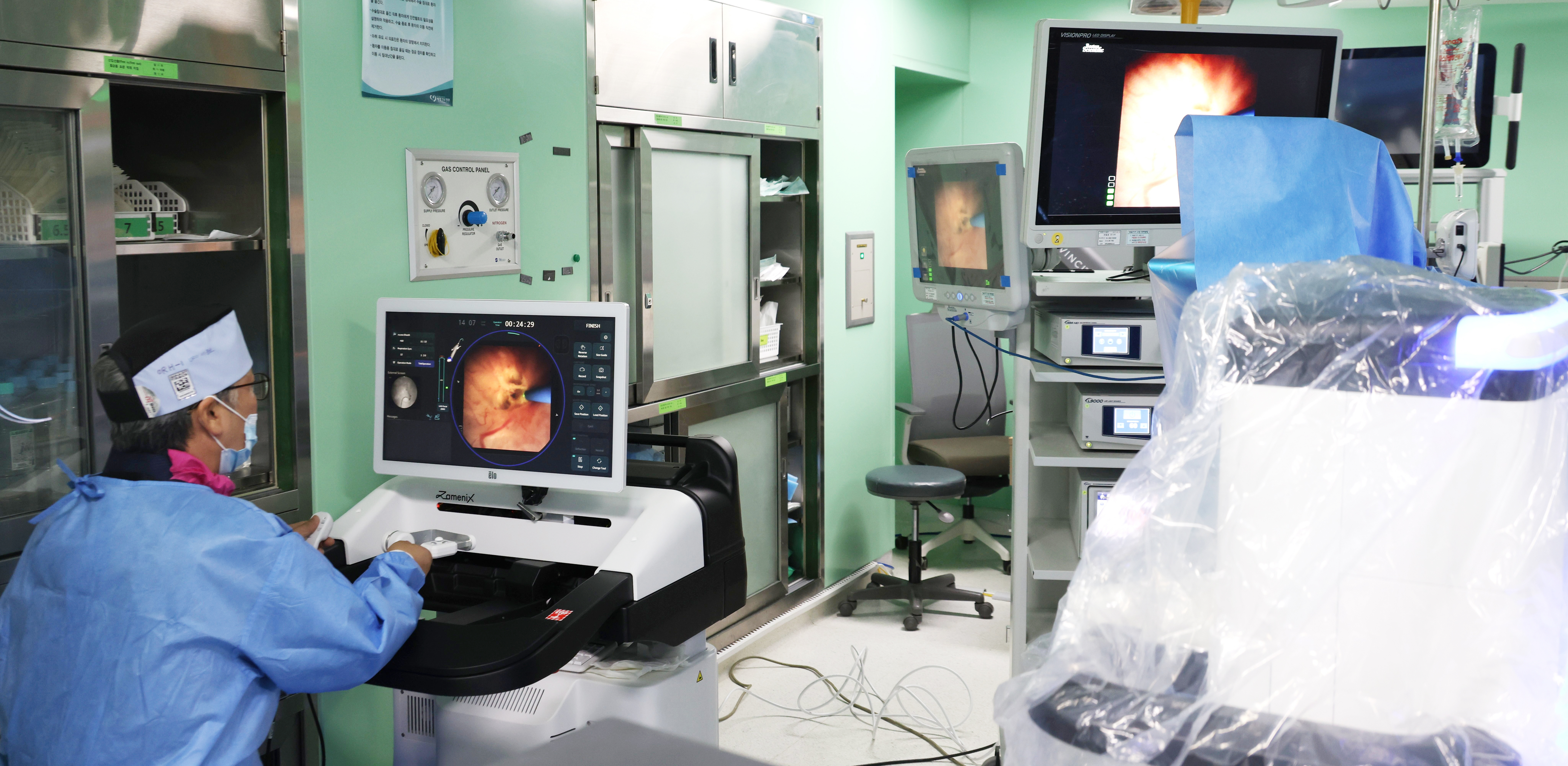 세명기독병원 비뇨의학센터 이중호 센터장이 자메닉스 AI로봇으로 신장결석 수술을 하는 모습 |
