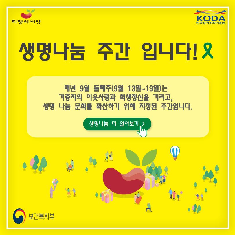 장기 등 이식에 관한 법률에 따라 매년 9월 둘째주 월요일부터 일주일간 열리는 생명 나눔 주간은 장기나 인체조직 기증자의 이웃 사랑과 희생 정신을 기리고 생명 나눔 문화 확산을 위해 마련됐습니다.